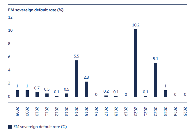 Of the 80 emerging markets in our investment universe, only two – Bolivia and Senegal – are at risk of default. Even if these countries were to default on their debts, which may yet be avoided, the impact on the overall asset class would be negligible – their weights in the JP Morgan EMBI Sovereign Index are just 0.22% and 0.23% respectively. Across the EM asset class, there were no defaults in either of the past two years (Exhibit 2).