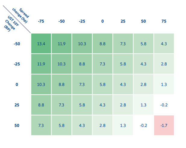 What about local currency bonds? Based on our expectation of a weaker dollar, we believe these could again outperform hard currency markets, as they did in 2025. These assets may also benefit from rate cuts in some emerging markets. The following grid shows a range of possibilities for the JP Morgan Government Bond Index-Emerging Markets (GBI-EM) Global Diversified index, which tracks local currency bonds. These scenarios are based on potential changes in foreign exchange and local rates (Exhibit 5). Again, we believe they indicate a promising outlook.